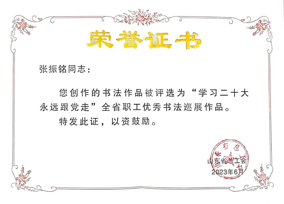 奥翔公司员工张振铭书法作品被评为全省职工优秀书法巡展作品