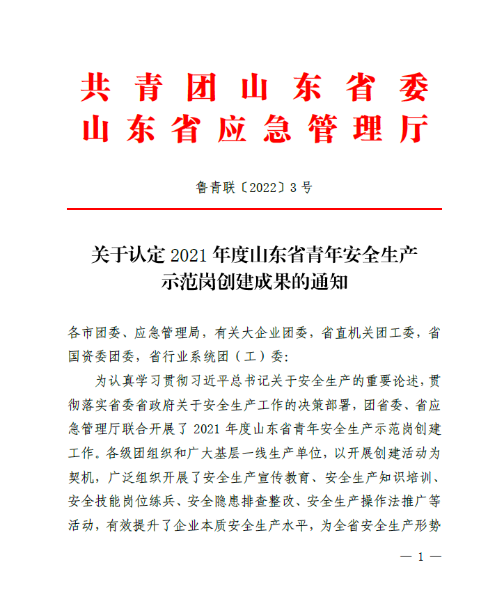1月5日,“2021年度山东省青年安全生产示范岗”评选结果揭晓,MK体育集团旗下沂南力诺太阳能电力工程有限公司荣获“山东省青年安全生产示范岗”荣誉称号。